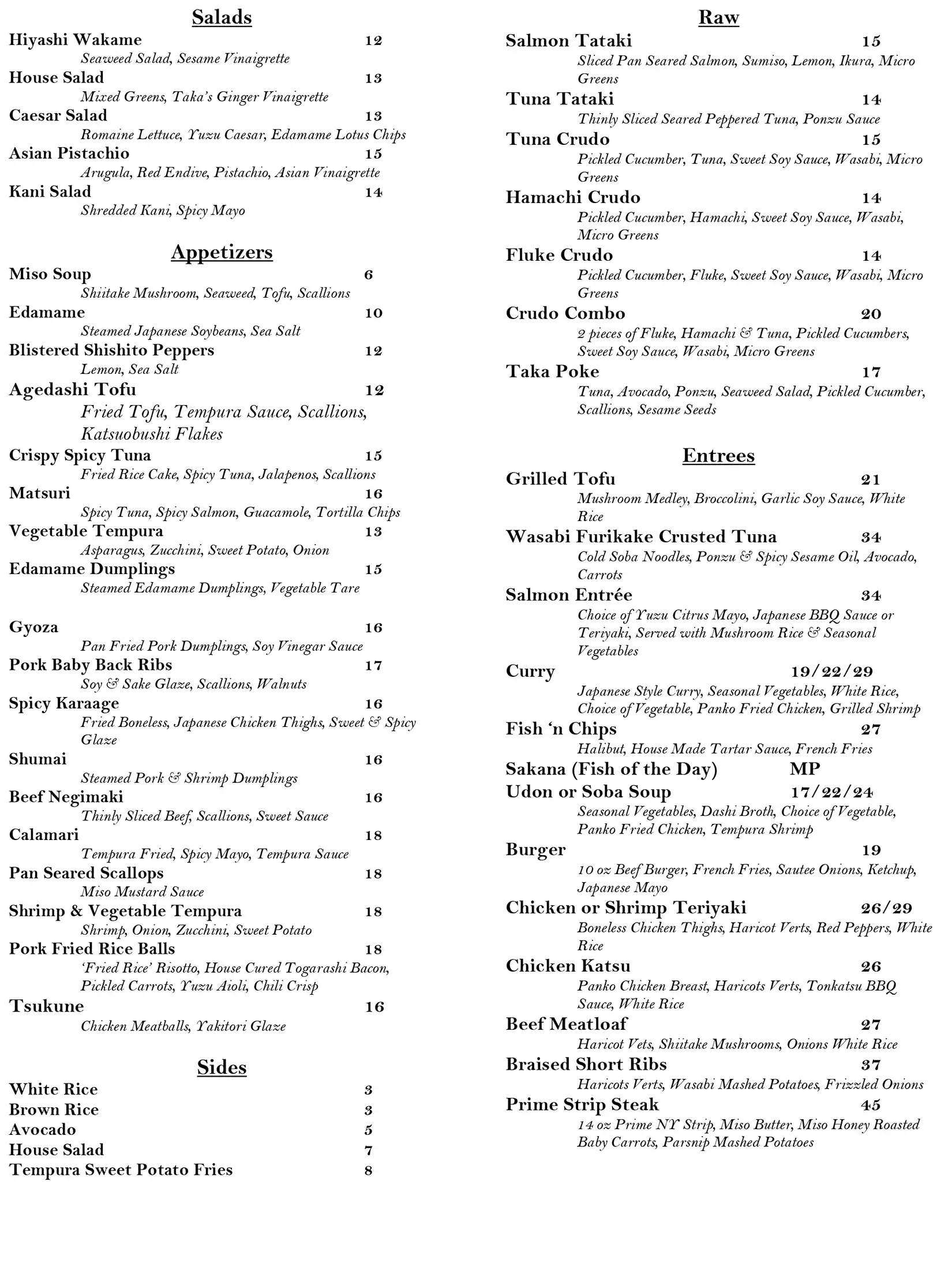 Taka Eat-In Menu